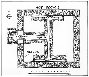 The hot room, quite naturally, was more involved. The main part of the room appears to have been about 9' square but with a 5' apsidal extension on its east side. The main room had a hypocaust floor of which some 20 brick pillars survived, many at their original height. The walls of the main room were 2' thick mortared flint with a double layer of brick running through them. The wall thickness decreased slightly on the apsidal extension. A furnace and stokehole were situated on the south side of the hot room, the furnace flue to the hypocaust floor being approx 6' x 2'. Water to produce steam came from the sump on the higher ground to the east.
