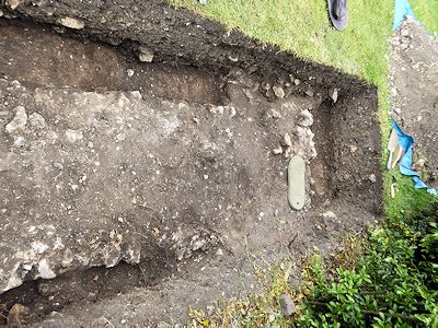 There were several other less sophisticated interments within the church and many outside. Outside the church, a grave was found almost wherever a trowel was put into the ground. The main graveyard was located rather unusually on on the north side of the Church but this area was not excavated. Its position was due to the fact that on the south side of the church, the ground rapidly fell away down a bank where the houses in Church Road are located today.