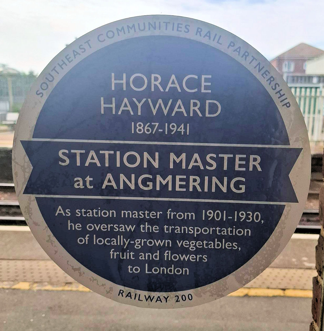 In June 2025, as part of the National Rail 200th year celebrations, a temporarry 'blue plaque' (see below) was affixed to the window of Angmering station, recording the service of Horace Hayward, station master between 1901 and 1930. This was one of 200 blue plaques produced by the Southeast Communities Rail Partnership to celebrate 200 people connected to its railway lines