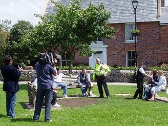 The Littlehampton/Angmering/Rustington/Ferring area was chosen primarily due to the success of our PCSOs in reducing the incidents of local crime and anti-social behaviour in the area. Since police early warning radiophones were provided in certain parts of Angmering at the beginning of this year, statistics appear to bear out this claim. Comparing the period 1 July - 31 December 2006 (6 months) to the period 1 January - 31 May 2007 (5 months), in five targetted areas in the parish, "crimed" calls have reduced by 24% and anti-social behaviour calls have reduced by 49%. What was noticeable during the filming today was the excellent relationship between the police and the teenagers, several of whom had participated in the making of the youth film "Our Place" which is to be shown at the community film show this Saturday evening in the Village Hall. The film produced from today's "shoot" will be shown at the ACPO Conference 2007.