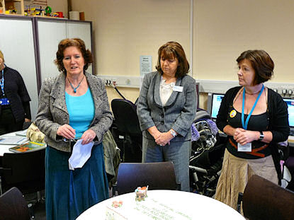 | (l-r) Cllr Pat Arculus, Cllr Urquhart & Caroline Gibbins | Waiting for the cake to be cut! | |