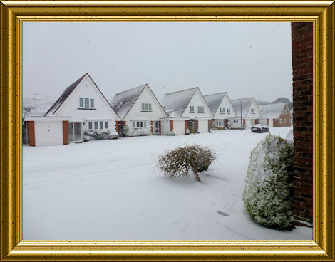 As forecast, the snow duly arrived this morning at about 8.00am and is still snowing (1.30pm). About 3-4cm has fallen in Angmering. St Wilfid's Primary School closed at lunchtime. Here, more for the benefit of our overseas readers, is a photo taken in Greenwood Drive early this afternoon: