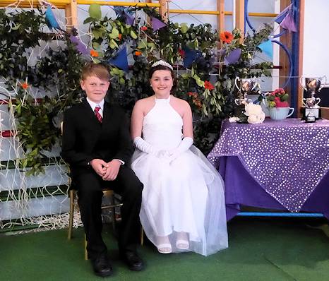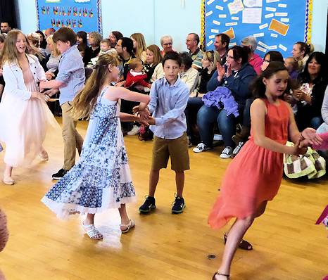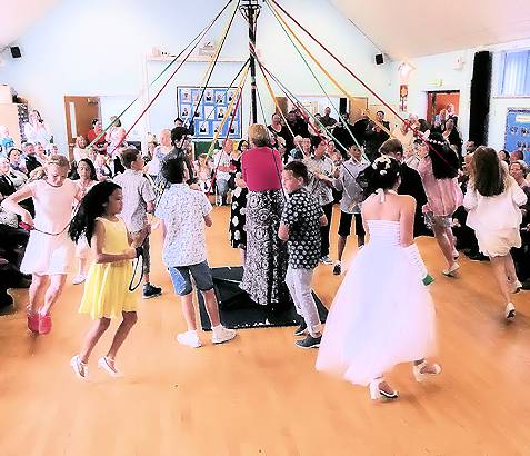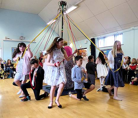 Elected as May King and May Queen this year were Reece Pratt and Catherina Marra, both 11 years old, the May Queen being crowned by last year's May King, who took off time from his new school to take part in the ceremony. Following the crowning, each of the school's classes ably performed some complex dances in the hall's confined space, with a team from Amethyst class concluding the performances with various intricate maypole dances.