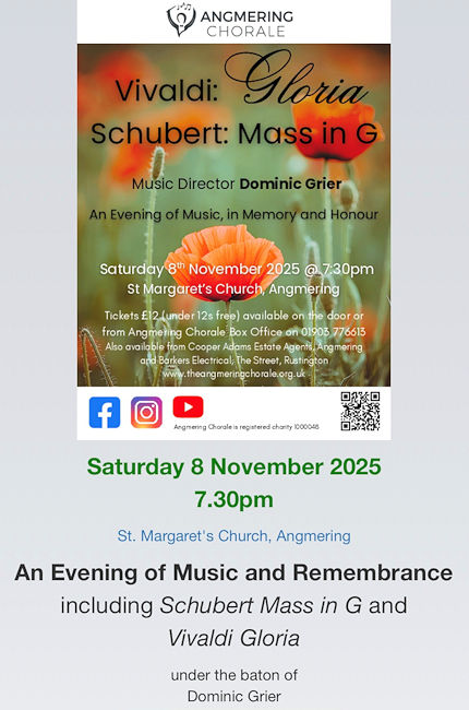 Tickets £12 (Under 12s free) - available from Angmering Chorale Box Office (Tel: 01903 776613) or Cooper Adams Estate Agents, Angmering, or, Barkers Electrical, The Street, Rustington. For further information, visit http://www.theangmeringchorale.org.uk