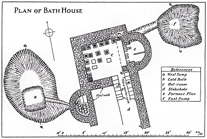 The west sump was 4' 6" deep, irregular in shape but, at its base, was about 3' square. This presumably would have been the receptacle for waste water from the bathhouse. The east sump was much deeper, 6' 10"; this would have been the main reservoir for serving the bathhouse.