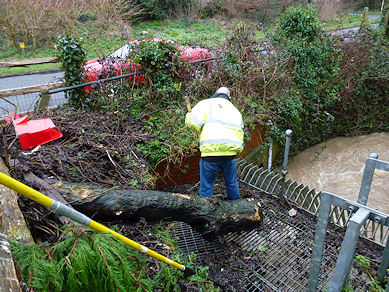 Alerted as a result of monitoring of the webcam, the Environment Agency rushed to the culvert and had removed the large log by 3.55pm (see photo below) and, within 5 minutes, the water level at the culvert entrance had fallen by about 200mm.