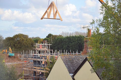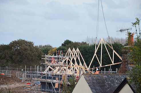 These photos were taken today of the first showhouse on Swanbourne Park, Roundstone Lane, indicating that it is under rapid construction as the roof timbers are lowered into place by crane. It is apparent that this is a timber-framed property.