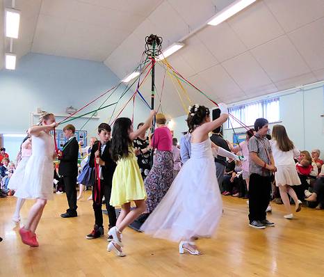 Elected as May King and May Queen this year were Reece Pratt and Catherina Marra, both 11 years old, the May Queen being crowned by last year's May King, who took off time from his new school to take part in the ceremony. Following the crowning, each of the school's classes ably performed some complex dances in the hall's confined space, with a team from Amethyst class concluding the performances with various intricate maypole dances.
