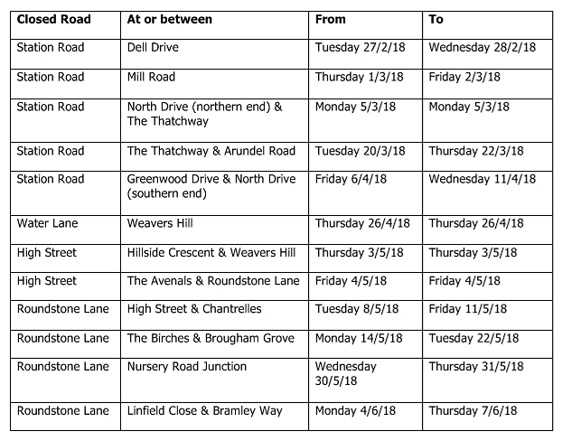 This is a reminder that roadworks commence on Monday 12 February in Station Road. These roadworks will continue throughout the villa until 4 June 2018. Further to the Schedule of Works published on this page on 4 January, the dates of these works has changed and the current dates are as follows. However, this latest schedule lists only ROAD CLOSURES and not other works on the roads where there may be just lane closures and traffic lights.