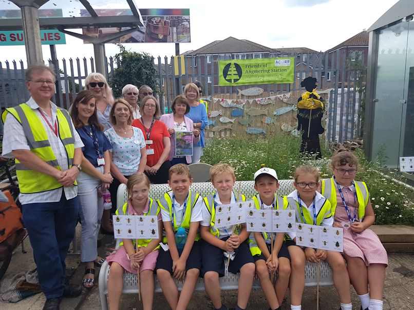 The Friends of Angmering Station is a partnership of Govia Thameslink Railway (GTR), station staff, Art for All, Men in Sheds and other local volunteers. Children from Georgian Gardens School, Rustington and one of their teachers and partnership chair, Deidre Carolin, who have been deeply involved with the project, were at the station today to hear Cllr Urquhart praise the children and the partnership for all their efforts. Mrs Carolin also thanked Men in Sheds for providing the substantial wooden flowerbed surround. The children were all given a bag containing WSCC information on recycling and Mini Wildflower Meadow seeds to help bees and other insects carry out the vital process of pollination. Also at the gathering was Samantha Lear, the Environment Manager at GTR and Angmering Station staff.