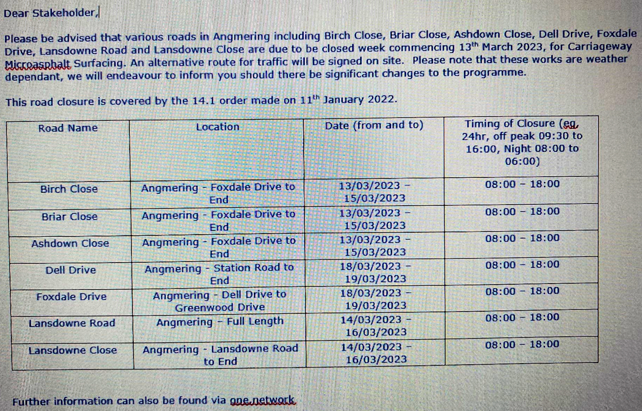 West Sussex County Council has announced road closures on The Dell for the week commencing Monday 13 March 2023 for "Carriageway Microasphelt Surfacing". Lansdowne Road and Lansdowne Close are also scheduled for the same work in that week. Greenwood Drive is scheduled for resurfacing on 15th and 16th April the week AFTER the schools' Easter Holidays!