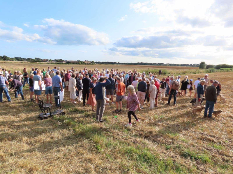 Some 150 local residents gathered on the fields on the west side of Bewley Road on Tuesday evening (20 August) to protest at the proposed building of 190 dwellings on prime agricultural land to the west of the road. Another 30 resident apologised for not being able to attend.