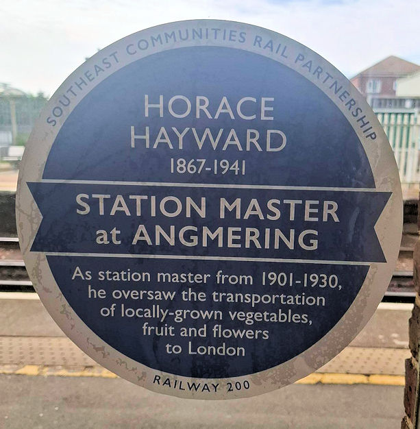Recently, as part of the National Rail 200th year celebrations, a temporarry 'blue plaque' (see below) was affixed to the window of Angmering station, recording the service of Horace Hayward, station master for 29 years. This was one of 200 blue plaques produced by the Southeast Communities Rail Partnership to celebrate 200 people connected to its railway lines. Horace Hayward, from a Littlehampton family, held the position of station master from 1901 until 1930, retiring after 50 years service with the railway. Horace also served as the postmaster at the station until the sub post office and sorting office there closed during his tenure.